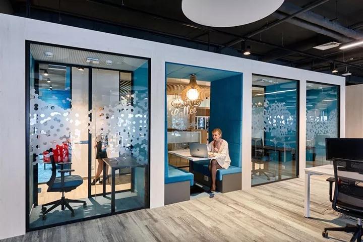 開放空間主要采用開放式框架系統來界定空間區域,這樣可以營造開闊的空間感;某些區域,這些分隔系統還兼作臨時頭腦風暴會議的白板功能。深圳裝修公司為了營造一個良好的工作氛圍,在工作區引入了吸音板吊頂系統,降低空間噪音。