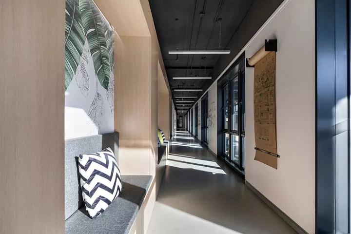 至于盒子以外的空間,設計師想凝聚更多的人文藝術氣息,選擇較多地去鋪陳展示各種抽象的藝術線條和畫作,同時為了不失去生活氣息,各個角落選擇顏色比較跳躍的家居什物,讓它作為一個流動的戶外廣場,讓人可以自在穿行其中,偶爾停駐觀察,經得住人聲鼎沸的喧擾,亦能提供心靈靜憩的安寧。在這里,大家認真辦公、生活、盡情交流、分享,它就是一個安放綠意,有極高包容度的公共空間。