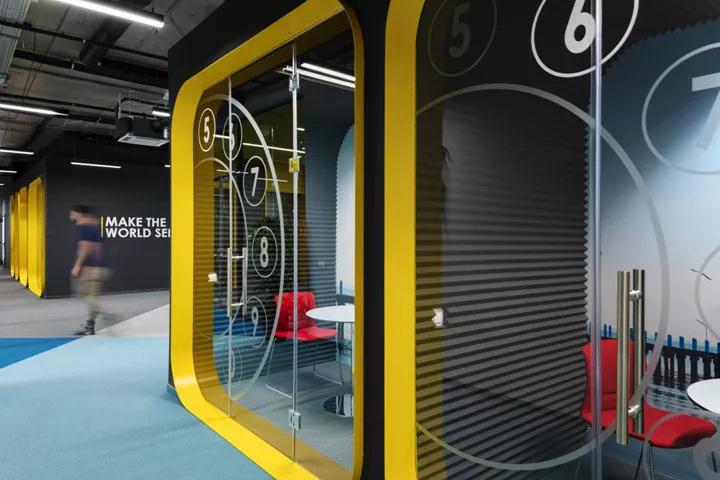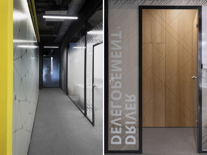 在任何情況下用戶的視覺和聽覺舒適性都是優(yōu)先考慮的。公司的業(yè)務詳情需要高度的私密性,這些都通過各種各樣的飾面得以實現(xiàn)。裝修公司設計團隊為公司創(chuàng)建了一套完整的視覺體系,包括玻璃上的平面圖形、壁紙和墻面圖形等。以企業(yè)色制作的墻面和地面圖形,以及根據(jù)不同功能和光線而應用的不同透明度的玻璃隔墻和木與黑色金屬制作的隔斷等。
