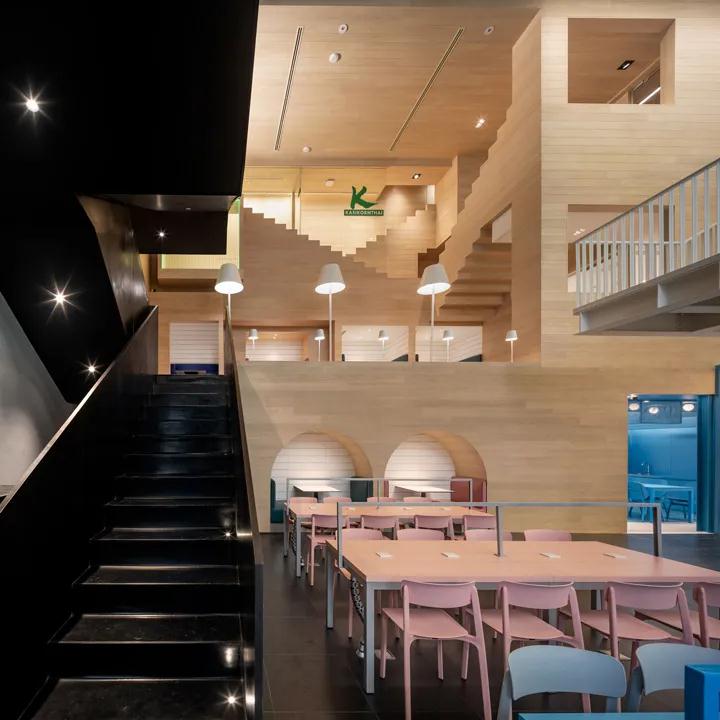 經過初步研究,設計團隊決定在購物中心內創建五個獨立的“建筑物”,但它們可以通過視線在彼此之間建立聯系。該場地中心計劃建造一個“安靜的建筑”,周圍是透明玻璃。由于ta是一個自由的地方,因此任何人都可以在任何時間(白天或晚上)自由進入,這種設計旨在營造一種非正式的氛圍來熱烈歡迎所有人,設計師將在入口處設置醒目的藍色咖啡吧,并將同色的休閑咖啡椅隨機擺放在周圍,以營造休閑氛圍。咖啡空間巧妙地與露臺座椅相連,形成了一個大型多功能時尚休閑區。