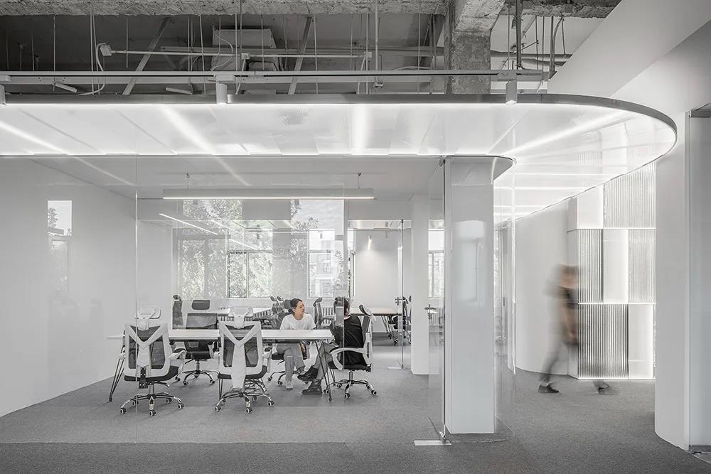 設(shè)計(jì)在空間中放置了一個(gè)螺旋狀的純白色裝置,引導(dǎo)人們深入其中。純白色的螺旋裝置,以竹林為意,垂直線條與不同材料的連接,營(yíng)造出抽象的“竹”,天花板的層次排列指向前進(jìn)的方向。這個(gè)區(qū)域目前的情況是四面墻上都有不可移動(dòng)的門洞,廁所的門洞正對(duì)著主辦公區(qū),視覺上的感覺很不好。該設(shè)備位于中心。一方面,它減輕了看對(duì)方的問題。另一方面,它也形成了一個(gè)空間節(jié)點(diǎn),就像園林中的景觀石。在建立記憶點(diǎn)的同時(shí),使空間形成一個(gè)匯聚的中心力。該裝置的輕質(zhì)材料靈活透氣,動(dòng)感的螺旋造型化解了空間中人流的沖突與交錯(cuò)。