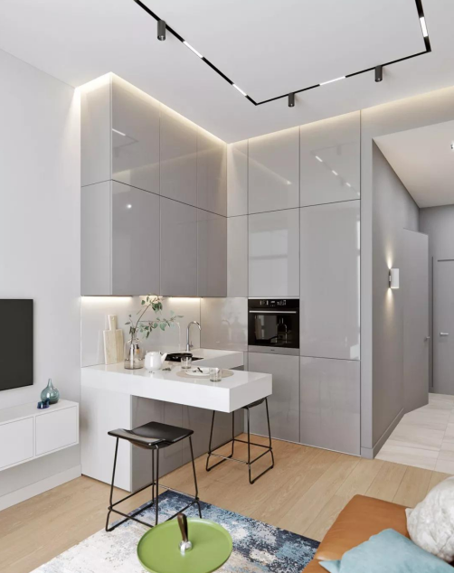 我們在小戶型裝修設計中因空間受限,時常難以妥善規(guī)劃,深圳裝飾公司雄宇裝飾便將公私領域一分為二,從玄關進入即可看見一道墻隔開客餐廳與臥室。公空間雖然狹小,但運用斑駁藍白地毯便能簡單作出區(qū)隔,此時搭配對比色深橘沙發(fā),就可輕易塑造視覺主焦點,穩(wěn)定室內不顯紊亂;廚房柜體則透過延續(xù)玄關淺灰色調,借此連貫空間營造寬敞感,料理區(qū)則保留簡易烹調器具,深圳家庭裝修并且以L型臺面連結吧臺桌面拓展出精簡用餐區(qū)。