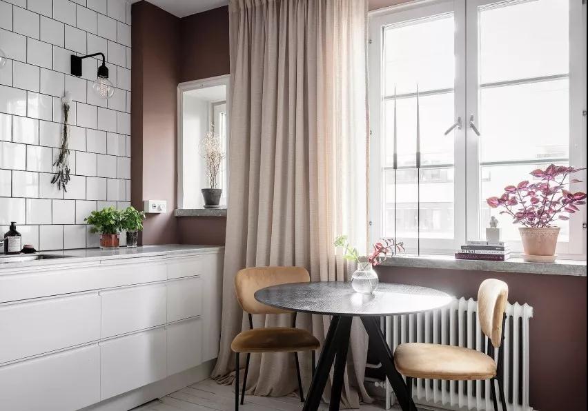 整體墻面漆繪煙熏粉營(yíng)造輕柔粉嫩氣息,鄰窗處配置低矮餐桌椅使光線自然灑落,相映沙發(fā)背墻的大面圓鏡,裝修設(shè)計(jì)使空間感無(wú)盡延展放大,同步考量清潔實(shí)用性,烹調(diào)區(qū)以純白壁磚與櫥柜筑起清爽視感,在可可棕、奶茶粉調(diào)的低彩軟件交織之下,體現(xiàn)優(yōu)雅小空間的舒心情景。