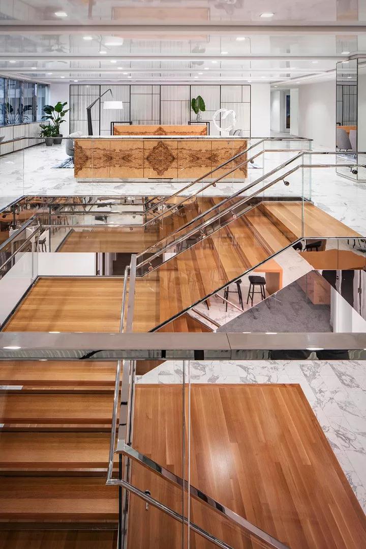 室內(nèi)裝修以通透的玻璃來制作隔墻,利于光和視線的穿透。黃褐色樹瘤橡木飾面板制作的接待前臺也是本案的一大看點(diǎn),均衡對稱的蝴蝶紋樣的木紋圖形帶來戲劇化的視覺效果,猶如一張代表公司形象的藝術(shù)名片,令人為之驚嘆。